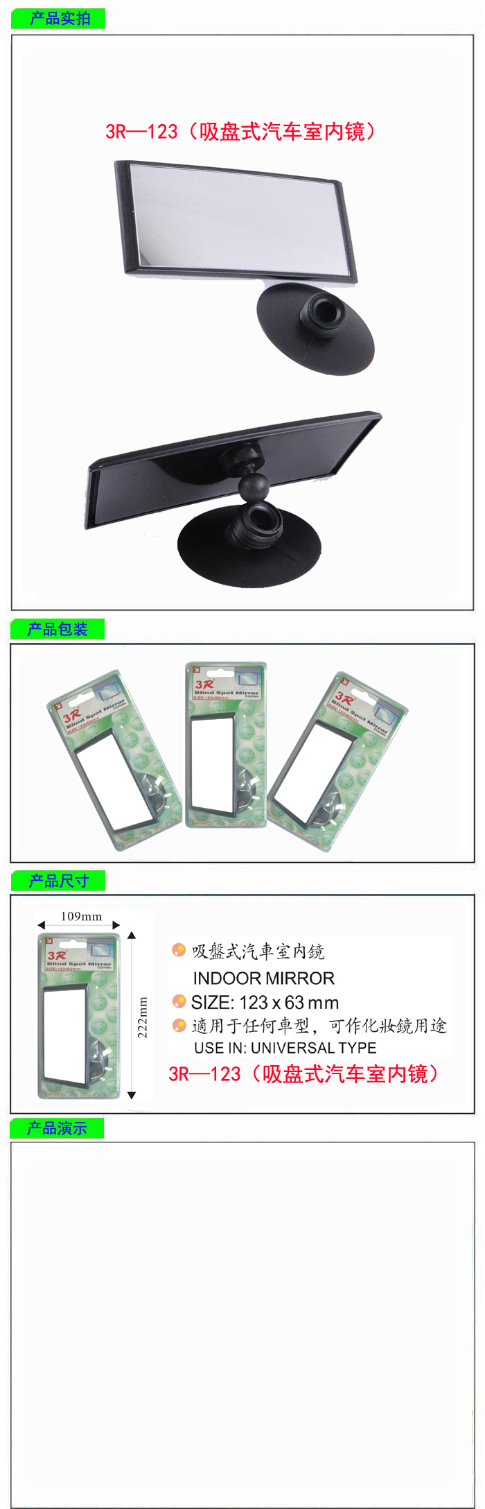 • 型號:   3R—123(吸盤式汽車室內鏡)